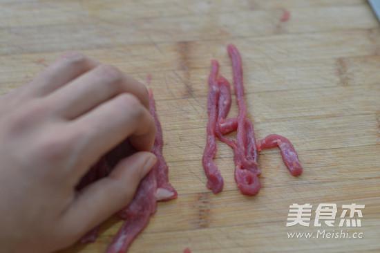 再順著牛肉的紋理切成5-6厘米長,3毫米左右寬的絲,有些朋友會疑問:“不是俗話說,橫切牛羊,豎切雞嗎?”原因看第6步