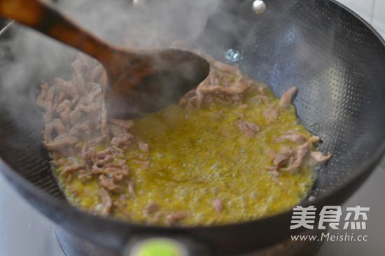油溫7成熱倒入牛肉絲,這個油溫要比平時炒肉絲的高一點,因為最后要把肉中的水分基本炒干