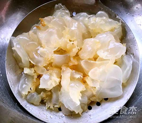 在超市買到腌漬的海蜇頭因為是腌漬的要在清水中浸泡2個小時再清洗干凈鍋中燒開水將海蜇頭在開水迅速焯一下時間不要過久
