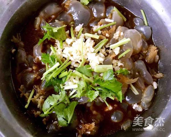 海蜇頭放人容器中倒入調味料煨制10分鐘入味