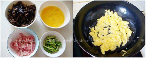 1.瘦豬肉切薄片,加少許鹽、料酒、水淀粉漿上腌制一會兒;泡發黑木耳去掉根部,撕成小塊備用;雞蛋打散,蒜薹洗凈切小段