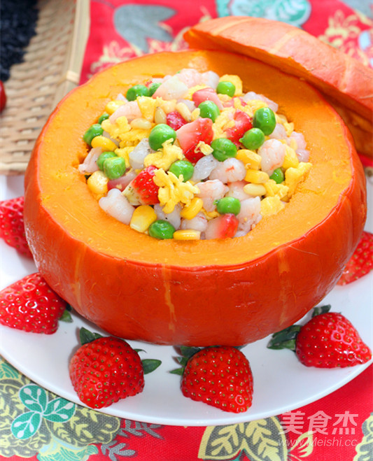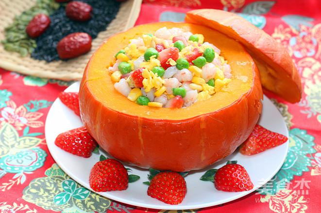 注:吃的時候可以把南瓜肉刮下來和烏米飯、玉米、青豆、松仁、蝦仁、草莓等拌在一起,非常的好吃。