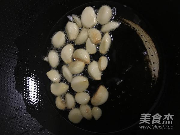 6.鍋內(nèi)放適量油,用量大概能沒過蒜粒一半的樣子,用小火將蒜粒煎至四面發(fā)黃,盛出備用。