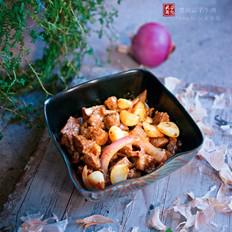 12.倒入牛肉粒、蒜粒和洋蔥絲(切寬些)翻炒。