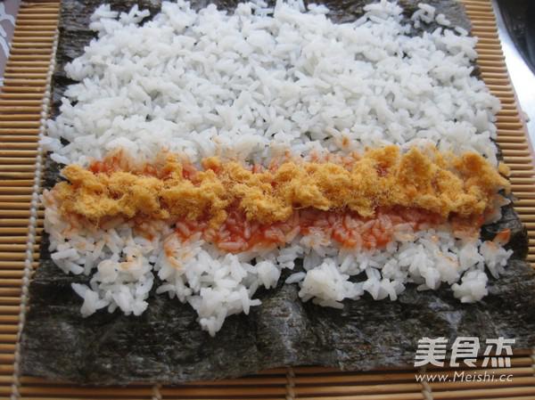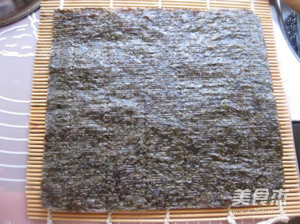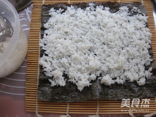 2、米飯平鋪在紫菜上面,注意首尾留一點空,不要鋪太滿了,不然卷的時候會擠出來。