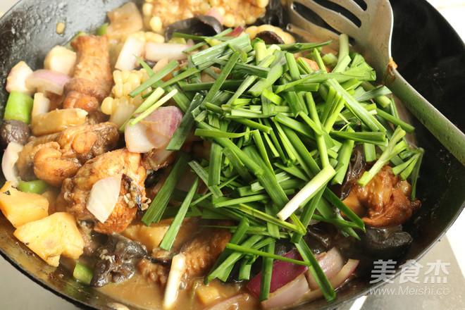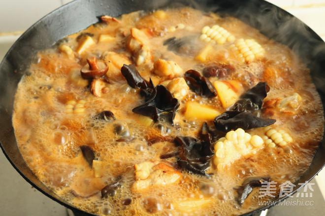 11.加入香菇、木耳、玉米和土豆翻炒。