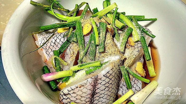 冰凍鱈魚塊,自然解凍、去鱗清洗,改小塊、吸干水份,放姜、蔥、料酒、胡椒粉、鹽腌十分鐘左右。