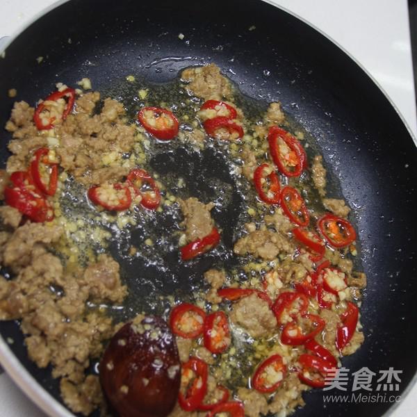 再把切好的肉末倒入翻炒,差不多好的時候倒入辣椒圈,炒兩下即可,盛出備用
