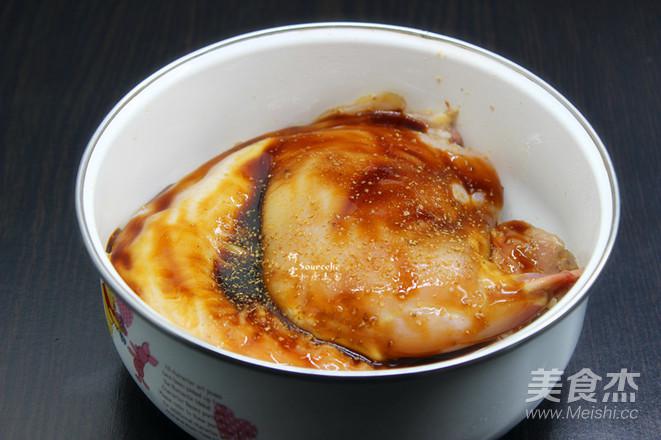 把腌制的液體倒掉,放入烤肉醬均勻按摩,放入冰箱腌制1小時; PS:廣州氣溫35度所以要放冰箱,防止變質。