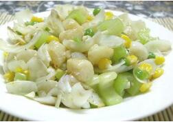 原料:百合200克、玉米粒100克、西芹100克、胡蘿卜50克,鹽、色拉油適量。