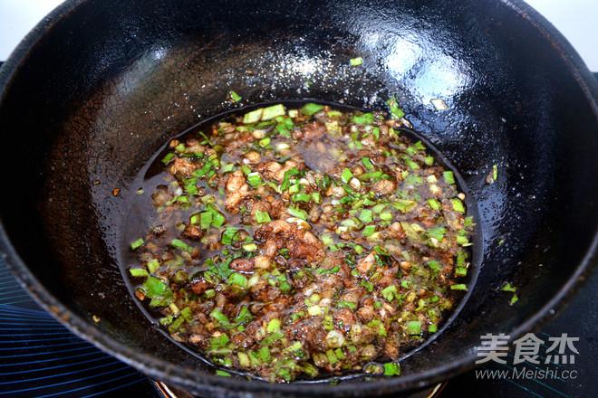 2.將五花肉切碎在鍋中包出油來,倒進蔥姜蒜,十三香。