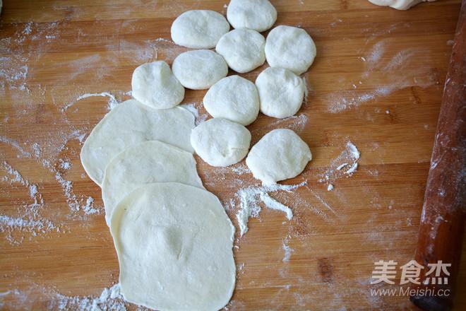 5.將面團揪成均等的小劑子,搟成圓形中間厚四邊薄的的面片。