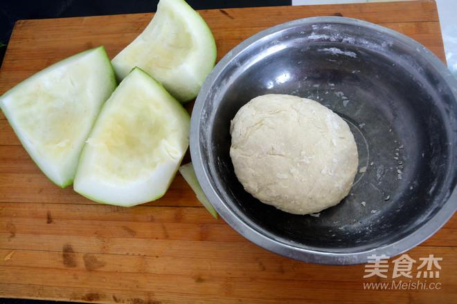 1.準備食材,將冬瓜去皮切成大塊,面粉和成面團進行醒發(fā)。