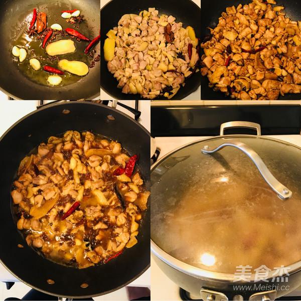撈出雞肉后,在剛剛用過沒洗的鍋里放入10克植物油,小火燒至三分熱后倒入準備好的炒料進行翻炒至香氣撲鼻,然后倒入過濾好的雞肉大火翻炒2分鐘. 然后加入8毫升老抽和5毫升料酒,翻炒2分鐘后,將準備好的開水倒入鍋中至差不多淹沒雞肉. 此時往鍋中加入8克雞精然后蓋上鍋蓋小火燜10分鐘
