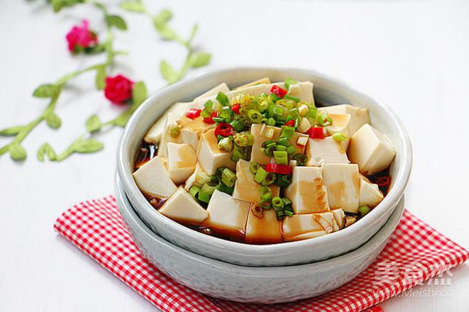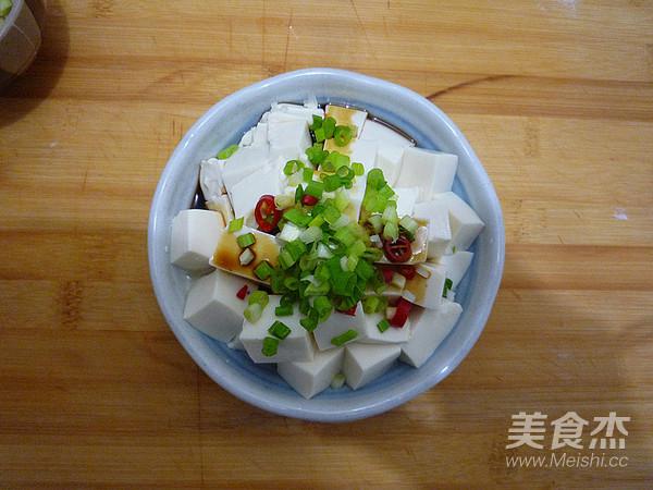蒸好的豆腐取出,倒去蒸出來的湯汁。