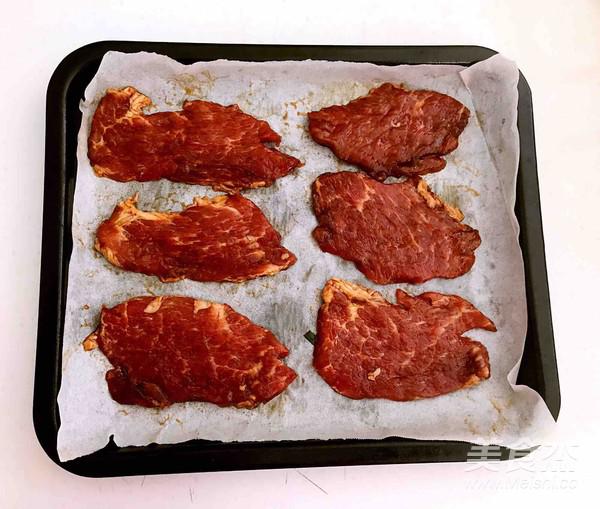 14.烤箱預熱3分鐘后放入烤盤,200度烤8分鐘,取出烤盤,把肉片翻面后繼續放入烤箱,210度烤7分鐘