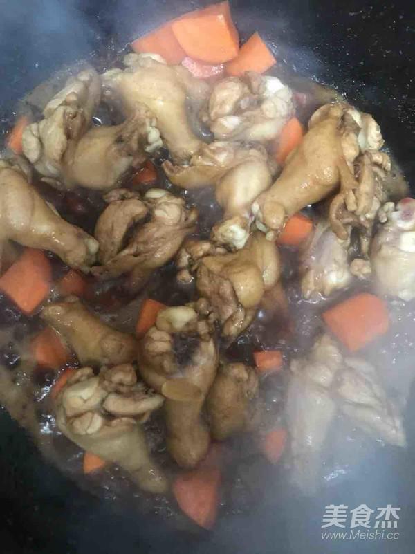 ?鍋底加入花生油,放入雞翅根炒至微黃后加入料酒、醬油、大料、少許水翻炒至變色