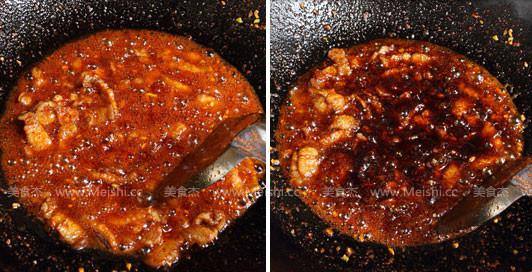5.煸炒約半分鐘出紅油,接著下五香粉和花椒面炒十秒出香氣,開大火,下醬油和黃酒爆香,接著下醋燒開