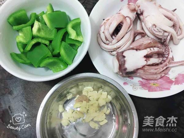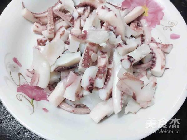 魷魚灼水,清理干凈,切塊(可以灼熟點等下炒的時候不用怕不熟,當然了也不用太久,會老)